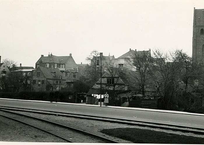 I baggrunden ses sidehuset til Stenboderne. Det blev i 1920'erne udvidet med en grundmuret tilbygning. T.v. skimtes Vinhusets gavle og baghus fra 1906.
